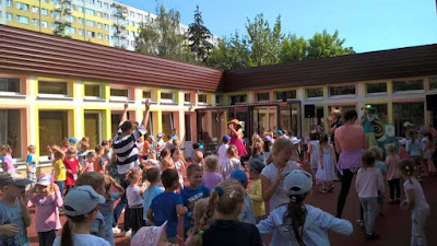 świeżym powietrzu. Przedszkolacy tańczyli, głośno śpiewali oraz odpowiadali na