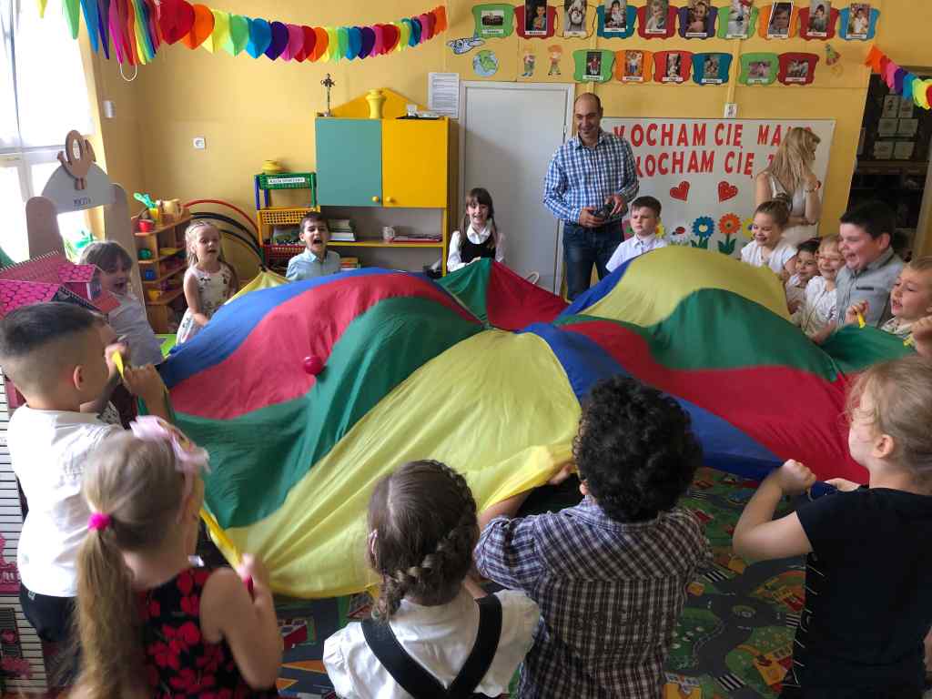 "Najlepsza drużyna to moja rodzina", pod tym hasłem odbyło się spotkanie rodzinne u Podróżników. Dzieci przygotowały krótkie przedstawienie dla Rodziców, ale najważniejszą częścią tego spotkania były konkursy dla rodziców i dzieci. Rodzice naśladowali zwierzęta, nawlekali korale na czas, tatusiowie tańczyli z swoimi córkami, wspólnie bawiliśmy się chustą animacyjną. Rodzice przypomnieli sobie piosenki z dziecięcych bajek z ich dzieciństwa, musieli odgadnąć "Jaka to melodia?" Był to bardzo emocjonujący i radosny dzień dla dzieci i rodziców, który będziemy wspominać bardzo długo. Dziękujemy Rodzicom za przybycie.